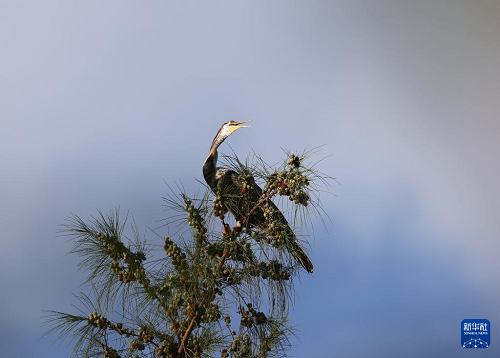 這是7月11日在海南昌江海尾國家濕地公園拍攝的黑腹蛇鵜。(新華社發(fā) 薛美麗 攝)