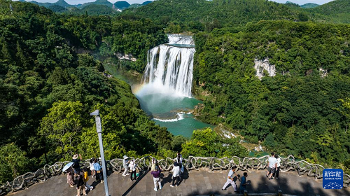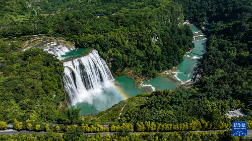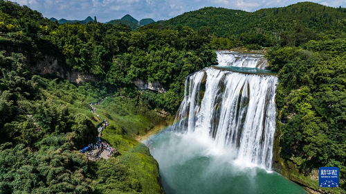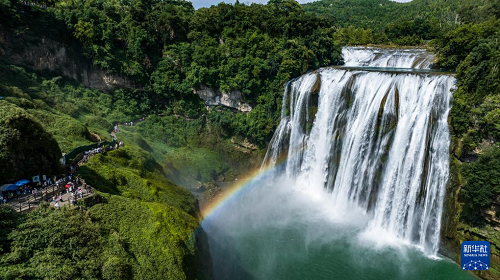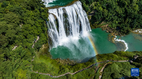 7月16日,游客在貴州省安順市黃果樹瀑布景區(qū)游覽(無(wú)人機(jī)照片)。(新華社記者 陶亮 攝)
