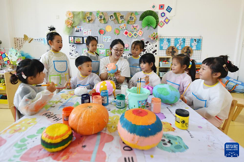 7月17日,在山東省青島市市北區(qū)第二實(shí)驗(yàn)幼兒園開(kāi)展的“夏天真有趣”繪畫(huà)活動(dòng)中,老師指導(dǎo)小朋友彩繪南瓜創(chuàng)意畫(huà)。(新華社發(fā) 王海濱 攝)