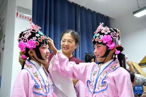 7月17日,在江西省樟樹(shù)市大橋街道金橋社區(qū)新時(shí)代文明實(shí)踐站,大橋文工團(tuán)演員在給學(xué)習(xí)采茶戲的孩子整理頭飾。(新華社發(fā) 周亮 攝)