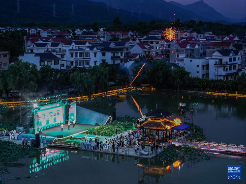 這是建德市大慈巖鎮(zhèn)的荷花節(jié)演出現(xiàn)場(7月17日攝,無人機照片)。(新華社記者 徐昱 攝)