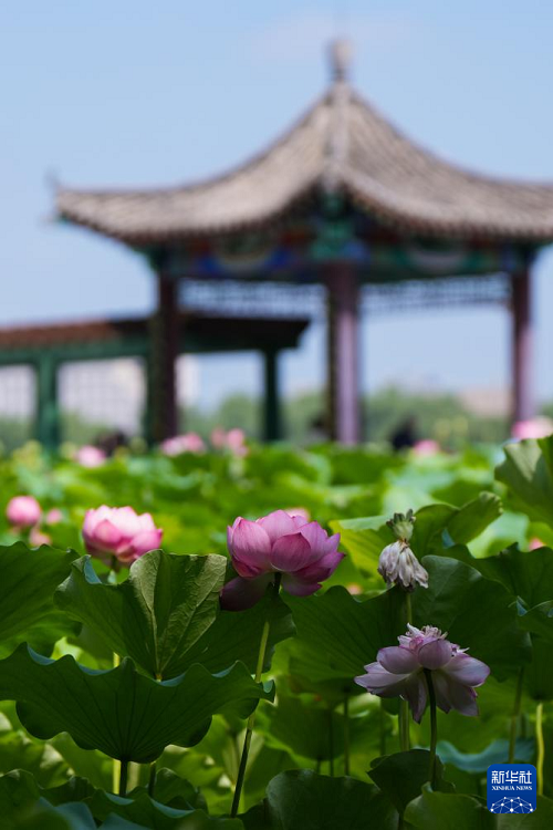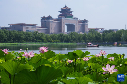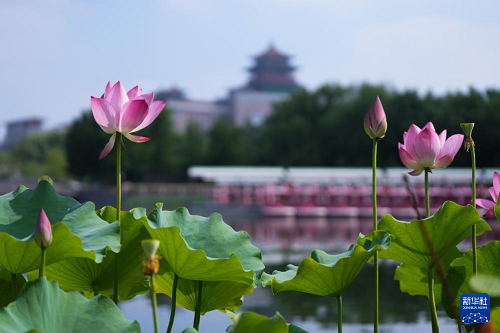 7月21日,北京蓮花池公園盛開的荷花映襯著遠(yuǎn)處的北京西站。(新華社記者 鄭煥松 攝)