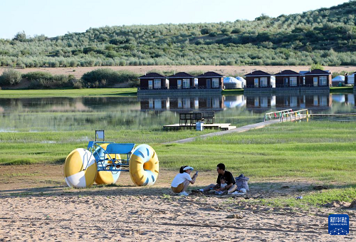 7月21日,游客在內(nèi)蒙古自治區(qū)赤峰市巴林右旗大板鎮(zhèn)翁根毛都嘎查境內(nèi)的沙地草原休閑。(新華社記者 侯俊 攝)
