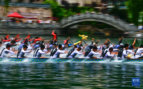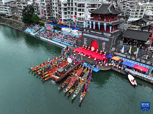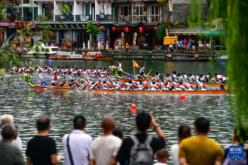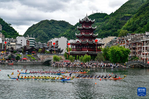 7月22日,2025年民體杯全國龍舟比賽在貴州省黔東南苗族侗族自治州鎮(zhèn)遠古城開幕。來自全國各地的10支龍舟隊伍同場競技,在鎮(zhèn)遠古城的?陽河上參加為期兩天的水上競速。賽事期間同時舉辦非遺展演、“龍神嫁妹”主題巡演等豐富多彩的活動。
