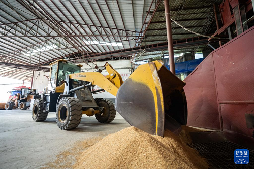 7月24日,在常德市鼎城區(qū)雙橋坪鎮(zhèn)一個(gè)水稻烘干工廠,工人駕駛鏟車把稻谷放入烘干設(shè)備。(新華社記者 周勉 攝)