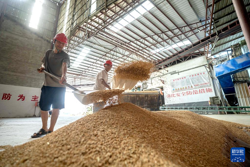 7月24日,在常德市鼎城區(qū)雙橋坪鎮(zhèn)一個(gè)水稻烘干工廠,工人把稻谷放入烘干設(shè)備。(新華社記者 陳思汗 攝)