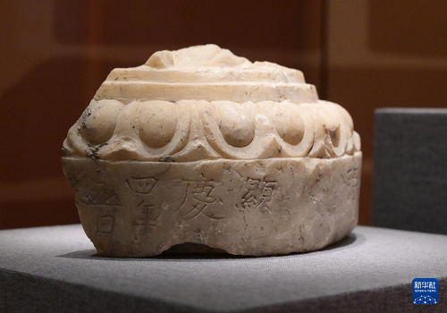 這是一件刻有“顯慶四年五月”字樣的唐代漢白玉蓮花座殘件(7月28日攝)。(新華社記者 李賀 攝)