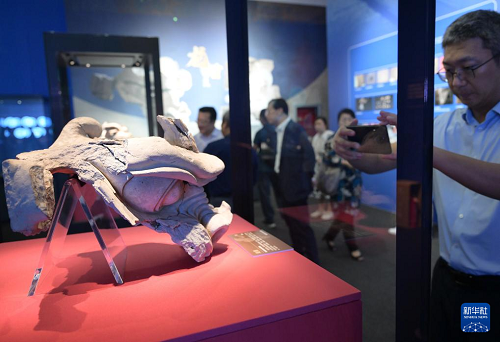 7月28日,觀眾在欣賞拍攝出土于雄安古州城遺址的唐代龍首。(新華社記者 李賀 攝)