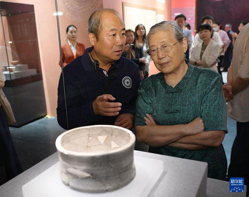7月28日,著名考古學家、中國社會科學院考古研究所研究員安家瑤(右)在雄安新區(qū)聯合考古隊領隊何歲利的陪同下參觀展覽。(新華社記者 李賀 攝)