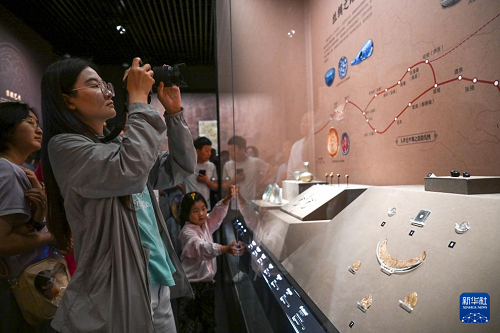 7月30日,游客在內(nèi)蒙古呼和浩特市內(nèi)蒙古博物院新館拍攝展品。(新華社記者 貝赫 攝)