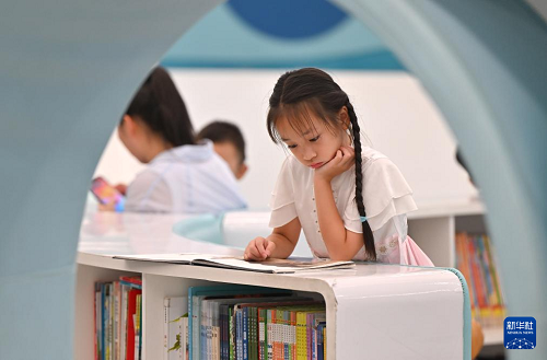 8月3日,小朋友在位于??谑械暮D鲜D書(shū)館讀書(shū)。(新華社記者 郭程 攝)