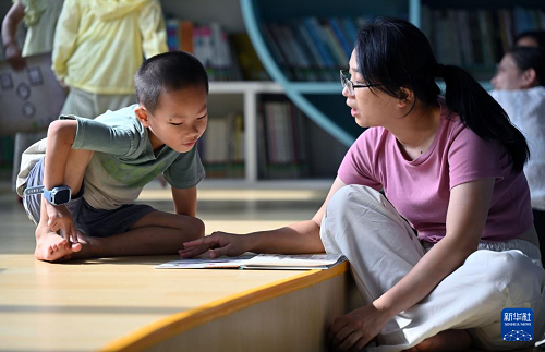 8月3日,家長(zhǎng)帶著孩子在位于??谑械暮D鲜D書(shū)館讀書(shū)。(新華社記者 郭程 攝)