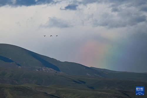 8月3日,一道彩虹出現(xiàn)在那拉提草原的上空。(新華社記者 辛悅衛(wèi) 攝)