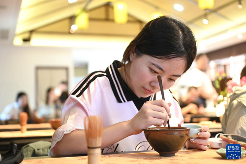 8月5日,在浙江省杭州市余杭區(qū)徑山村,一名游客體驗傳統(tǒng)點茶。(新華社記者 毛竹 攝)
