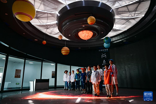 7月29日,參加暑期研學(xué)的小朋友在冷湖鎮(zhèn)“冷湖實(shí)驗(yàn)室”學(xué)習(xí)天文知識(shí)。(新華社記者 張龍 攝)