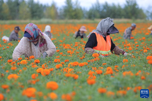 8月7日,在黑龍江省佳木斯市富錦市一處萬壽菊種植基地,村民采摘萬壽菊。(新華社發(fā) 曲玉寶 攝)
