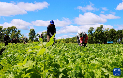 8月7日,在北大荒集團(tuán)黑龍江紅星農(nóng)場(chǎng)有機(jī)白菜田地里,工人開展除草作業(yè)。(新華社發(fā) 侯越攝)