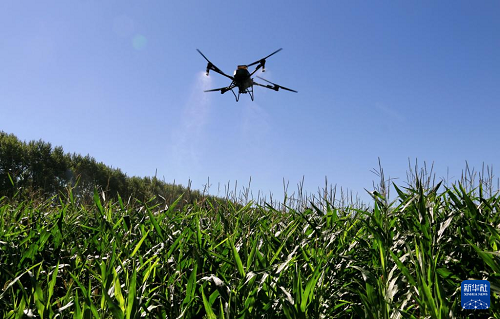 8月7日,在北大荒集團(tuán)黑龍江格球山農(nóng)場(chǎng)有限公司第二管理區(qū),一架植保無人機(jī)為玉米噴施“營養(yǎng)液”。(新華社發(fā) 陸文祥 攝)
