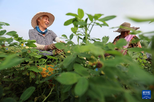 8月7日,在河北省石家莊市正定縣良下村,農(nóng)民忙著采收花生。(新華社發(fā) 張曉峰 攝)