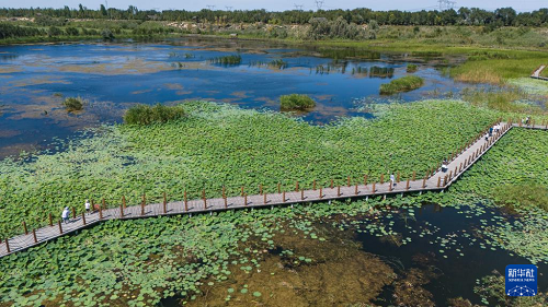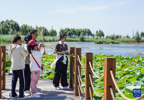 8月10日,游客在瑪納斯國家濕地公園游玩。(新華社記者 周佳誼 攝)