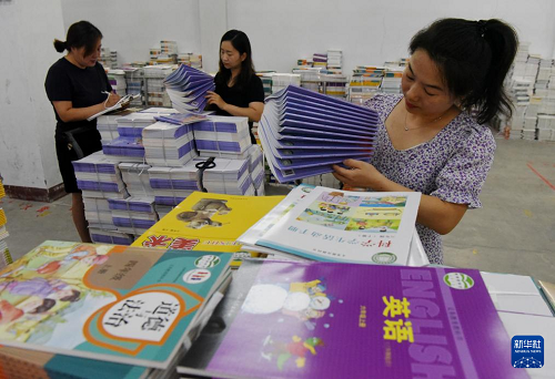 8月14日,河北省石家莊市欒城區(qū)新華書店工作人員在倉庫清點(diǎn)教材。(新華社發(fā) 李明發(fā) 攝)