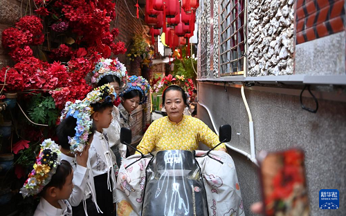 8月18日,福建泉州蟳埔村,一名蟳埔女騎電動(dòng)車從幾名體驗(yàn)“簪花圍”的游客前經(jīng)過(guò)。(新華社記者 肖瀟 攝)