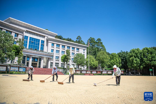 8月20日,人們?cè)谥貞c市永川區(qū)紅爐鎮(zhèn)政府廣場(chǎng)上晾曬糧食。(新華社記者 黃偉 攝)