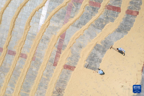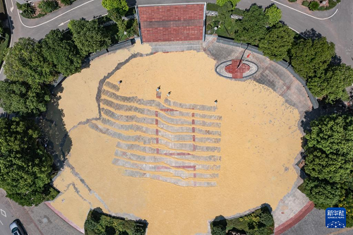 8月20日,人們?cè)谥貞c市永川區(qū)紅爐鎮(zhèn)政府廣場(chǎng)上晾曬糧食(無(wú)人機(jī)照片)。(新華社記者 黃偉 攝)