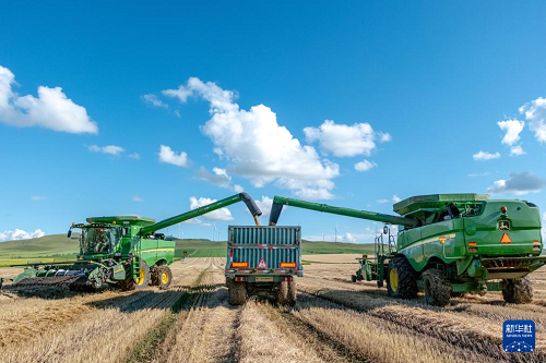 8月20日,呼倫貝爾農(nóng)墾拉布大林農(nóng)場的工人駕駛農(nóng)機將收獲的小麥裝車。(新華社記者 馬金瑞 攝)