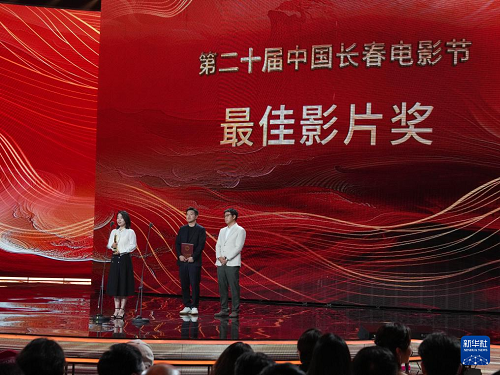 8月28日,在第二十屆中國長春電影節(jié)閉幕式上,《南京照相館》主創(chuàng)團隊代表致辭。(新華社記者 張楠 攝)