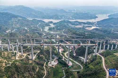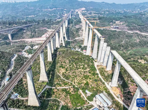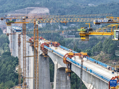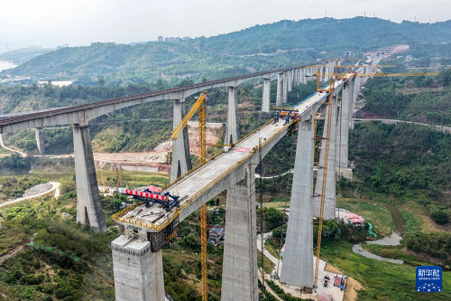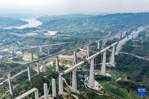 這是9月1日拍攝的渝萬高鐵蔡家溝雙線特大橋建設(shè)現(xiàn)場(無人機(jī)照片)。(新華社發(fā) 孫鵬 攝)