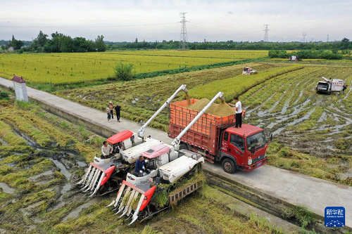 9月1日,在四川省內(nèi)江市東興區(qū)田家鎮(zhèn)趙家壩社區(qū),農(nóng)機手在水稻搶收現(xiàn)場裝車。(新華社發(fā) 李建明 攝)