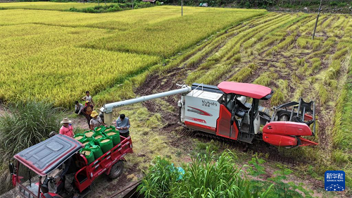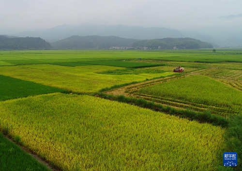 8月31日,在福建省南平市浦城縣仙陽鎮(zhèn),村民駕駛收割機在田間作業(yè)(無人機照片)。(新華社發(fā) 黃杰敏 攝)