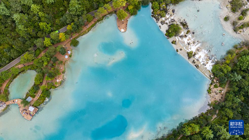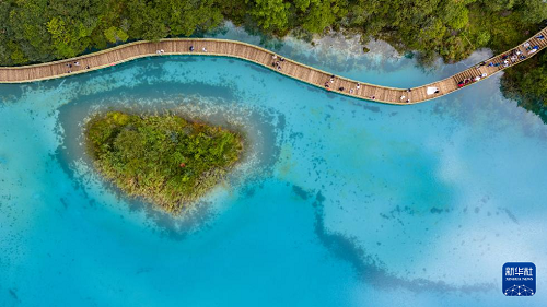9月8日,游客在藍(lán)月谷游玩(無人機照片)。(新華社記者 胡超 攝)