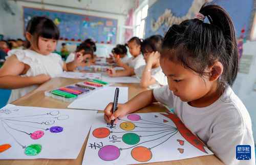 9月9日,河北省遵化市遵化鎮(zhèn)南關(guān)幼兒園的小朋友在繪制美術(shù)作品感念師恩。(新華社發(fā) 劉滿倉 攝)