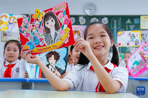 9月9日,在江蘇省句容市實(shí)驗(yàn)小學(xué),學(xué)生展示手工制作的教師節(jié)賀卡。(新華社發(fā) 鐘學(xué)滿 攝)