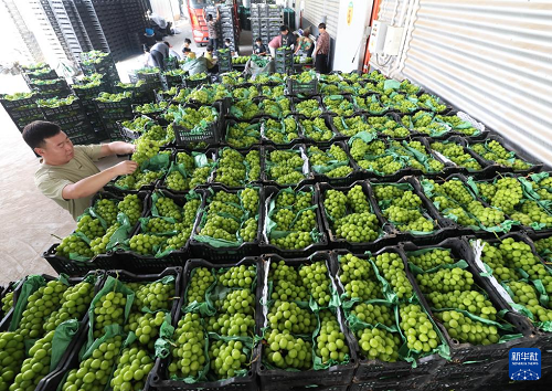 9月11日,在河北省晉州市桃園鎮(zhèn)周頭村一家葡萄種植基地,農(nóng)民將采收的葡萄分揀裝箱。(新華社記者 楊世堯 攝)
