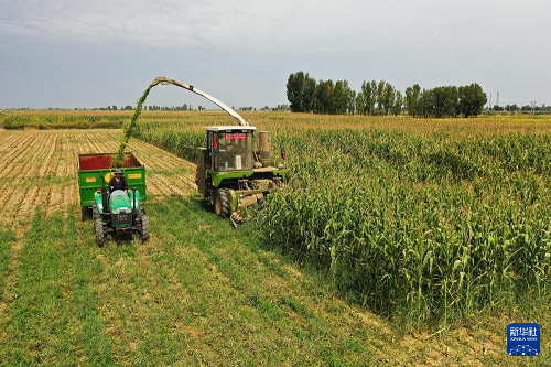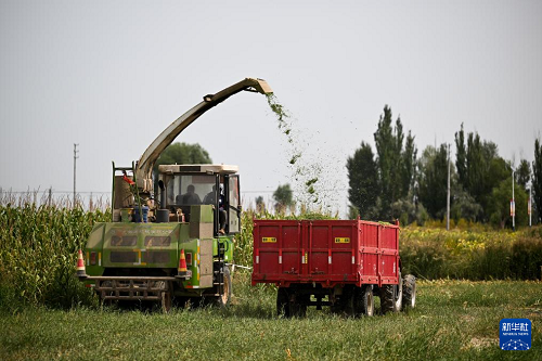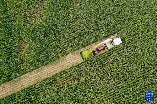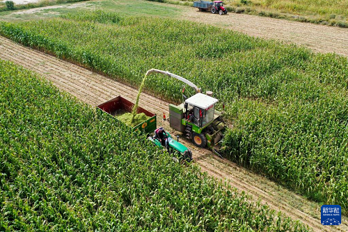 9月11日,農(nóng)機(jī)手操作農(nóng)機(jī)在杭錦旗吉日嘎朗圖鎮(zhèn)格更召嘎查田間收割青貯玉米。(新華社記者 李志鵬 攝)