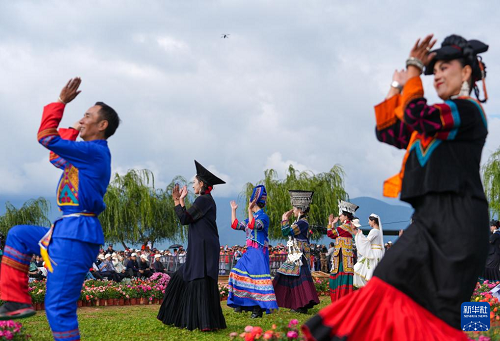 9月16日,當(dāng)?shù)厝罕娞饌鹘y(tǒng)甲搓舞歡度轉(zhuǎn)山轉(zhuǎn)海節(jié)。(新華社記者 江宏景 攝)