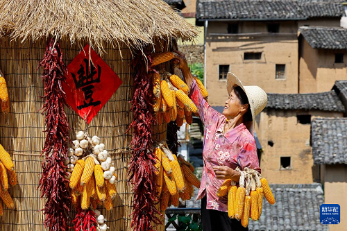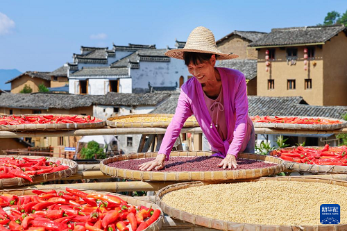 9月17日,安徽黃山歙縣陽(yáng)產(chǎn)村村民在土樓前晾曬農(nóng)作物。(新華社發(fā) 樊成柱 攝)