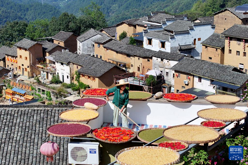 秋收時(shí)節(jié),在安徽省黃山市歙縣深渡鎮(zhèn)陽(yáng)產(chǎn)村,村民利用晴好天氣,抓緊晾曬收獲的辣椒、玉米、山核桃等農(nóng)作物,描繪出一幅山村“曬秋”圖。