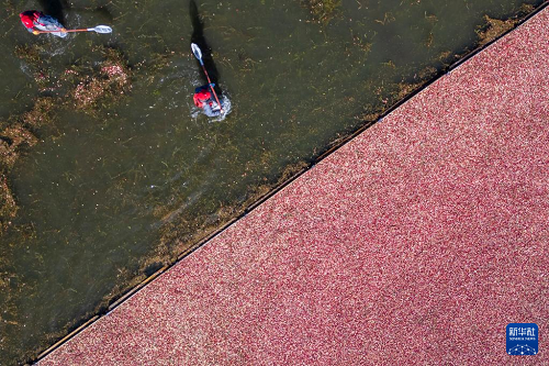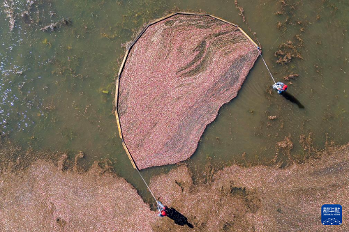 9月21日,在撫遠(yuǎn)市蔓越莓種植基地,工作人員在水中采收蔓越莓(無人機(jī)照片)。(新華社記者 張濤 攝)