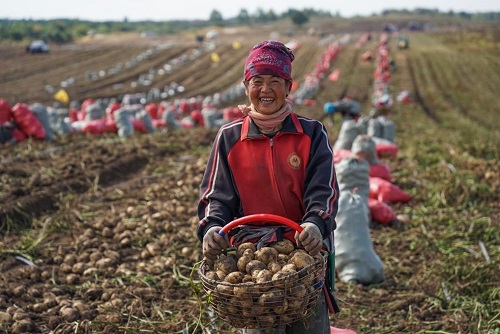 9月22日,河北省承德市圍場(chǎng)滿族蒙古族自治縣御道口鎮(zhèn)農(nóng)民在田間展示收獲的馬鈴薯。(新華社發(fā) 劉滿倉(cāng) 攝)