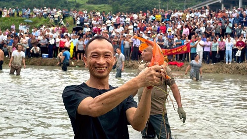 9月22日,在廣西南丹縣芒場(chǎng)鎮(zhèn)巴平村舉行的慶祝豐收節(jié)活動(dòng)上,村民展示抓到的錦鯉。(新華社發(fā) 高東風(fēng) 攝)