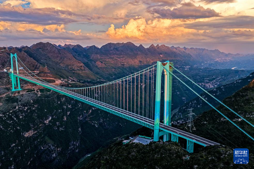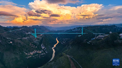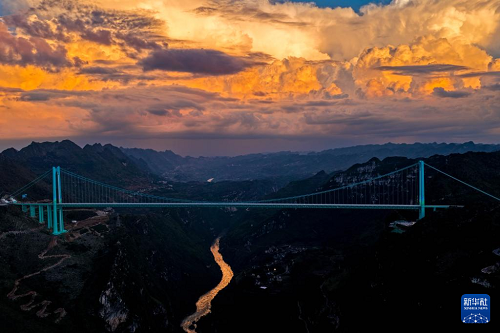 9月28日拍攝的夕陽下的貴州花江峽谷大橋(無人機照片)。(新華社記者 楊文斌 攝)