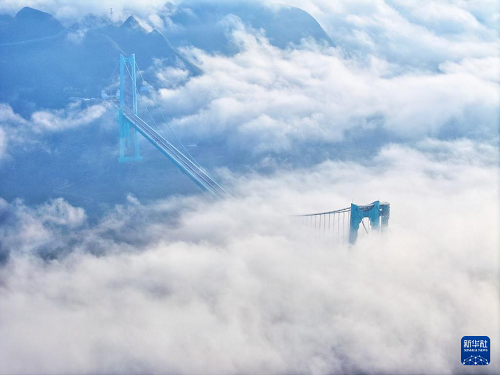 9月28日拍攝的云霧中的貴州花江峽谷大橋(無人機照片)。(新華社記者 劉續(xù) 攝)
