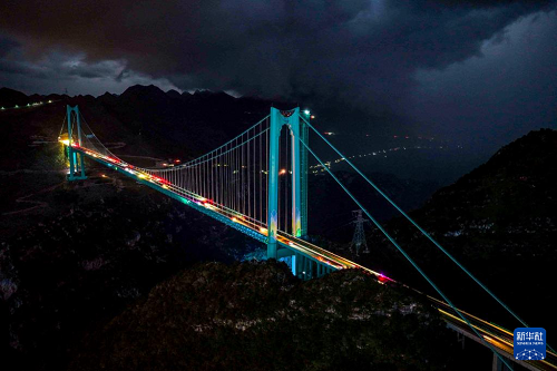9月28日拍攝的夜幕下的貴州花江峽谷大橋(無人機照片)。(新華社記者 楊文斌 攝)