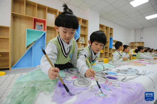 9月28日,甘肅省定西市安定區(qū)幼兒園的小朋友在繪制《我愛(ài)你中國(guó)》長(zhǎng)卷。(新華社發(fā) 王克賢 攝)