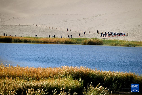 10月12日,游客在甘肅省敦煌市鳴沙山月牙泉景區(qū)游覽。(新華社發(fā) 張曉亮 攝)