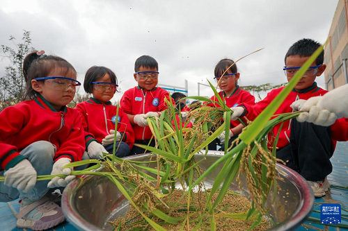10月15日,云南省曲靖市陸良縣大莫古鎮(zhèn)中心幼兒園的孩子們?cè)谛?nèi)勞動(dòng)基地體驗(yàn)打稻穗。(新華社發(fā) 王勇 攝)